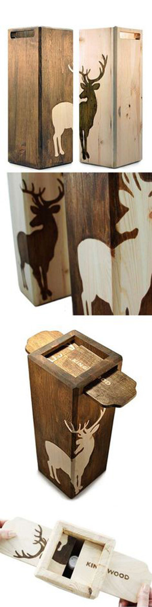 2. 這是一款非常經典的木質紅酒包裝盒,所選用的木頭有原始的、未經加工過的紋理,與紅酒自然釀造的特質相吻合。一頭美麗的鹿的剪影被烙印在木盒上,更加有自然氣息,開口處的抽拉木板拿下來便可以用作杯墊。