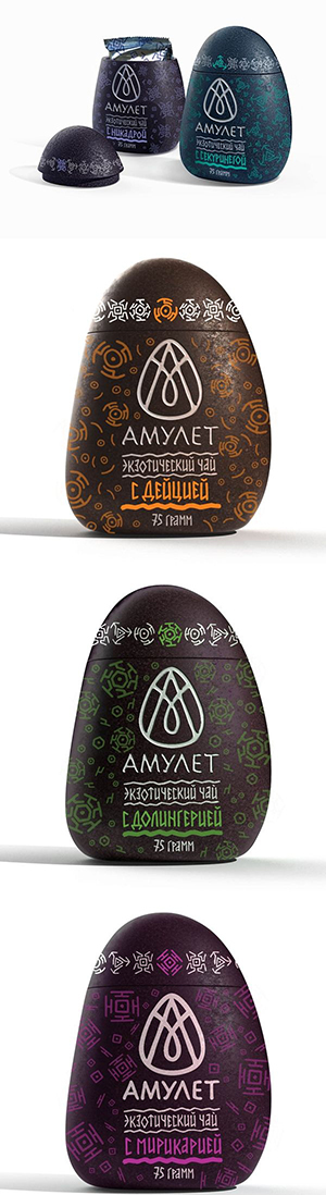 4. 鵝卵石形狀的茶葉盒,盒面上印刷的圖形和文字給人一種瑪雅文化的感覺。
