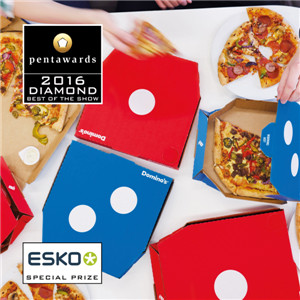 拿下最高榮譽鉆石獎的是 JKR 團隊為達美樂披薩設計的外賣包裝盒,拋棄了原先過多的元素,只留下具有辨識度的藍色和紅色的標識,搭配醒目的白色圓點,充分表現了 LESS IS MORE 的理念。