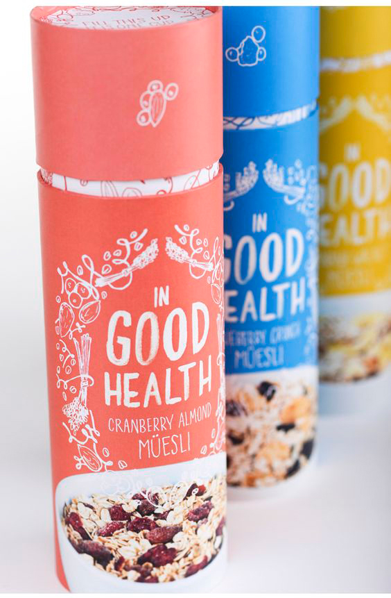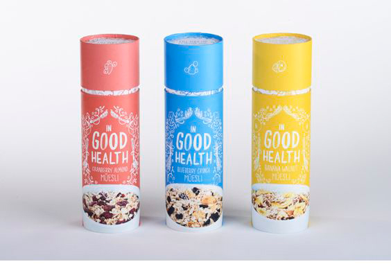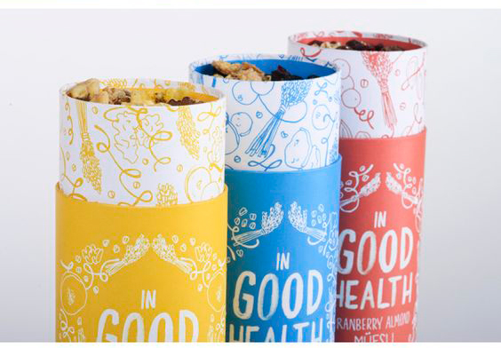 ? ? 我們在生活中經常見到的食品包裝一般是袋裝、盒裝或塑料罐裝的,像圖片中這種圓紙筒形狀的食品包裝設計還是比較少見的,三種口味的麥片分別用三種不同的顏色區分,手繪圖案和字體倍顯清新溫暖。
